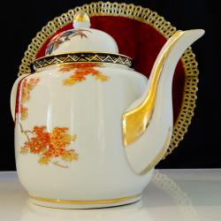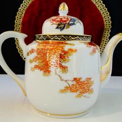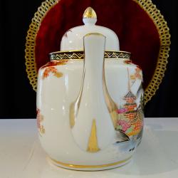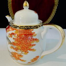 Порцеланов чайник, порцеланова кана, японски фин порцелан истинска Сацума на школа Kazan от периода Taisho 1912-1926 г., лимитирана серия, маркирана със златни символи на черен фон. Ръчно рисувана с божестевно красив японски есенен пейзаж – кокетни къщи сгушени в подножието на планински върхове, вижда се планината Фуджи и кленови листа ярко обагрени от есента. Възхитителна палитра от цветове, прецизно подчертана с много злато 24 карата. Безценна находка за любители и колекционери. Височина 16 см., дължина 22 см., диаметър 12 см., вместимост 1 литър. |
