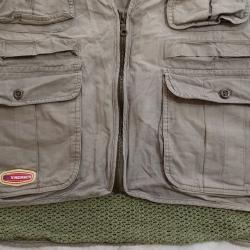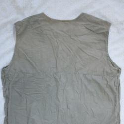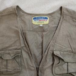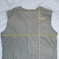 Елека е ползван, има леки забележки като промяна в цвета на места - вече прилича като на ловджийски:), иначе няма скъсано и може още да се ползва без проблем. Купуван е от Гърция, но е италиански. Приблизителни размери 60 см височина на 112-114 гръдна обиколка. Има 6 джоба с велкро и копчета.