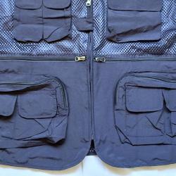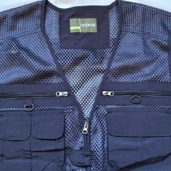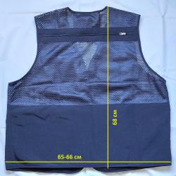 Елека е чисто нов, марка OUTDOOR. Внос от Англия. Бързо съхнещ плат и мрежа. Купих си го за мен, но ми е голям, размер не пише, сигурно е XL или XXL (на последната снимка съм сложил размери в см), има 16 джоба с ципове или велкро, които побират доста кутии и други неща - от пред 13 джоба, от вътре 2 джоба и 1 джоб на гърба. Цвят тъмно син.