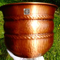 Стара немска медна ваза, медна кашпа, медна шампаниера, майсторска ръчна изработка от високо качествена чиста мед. Релефно кована с красиви битови орнаменти. Съда не е ползван със запазен етикет. Височина 16 см., диаметър 21 см., тегло 500 гр. Вместимост 5 литра.