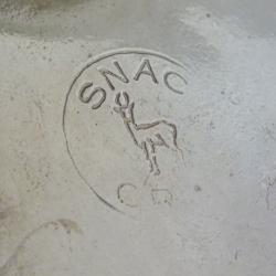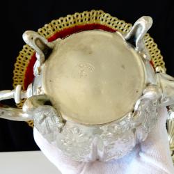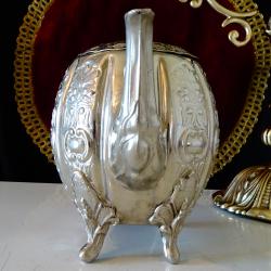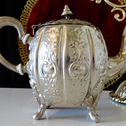 Стар меден чайник, кана, майсторска ръчна изработка от високо качестевна чиста мед, дебело посребрен с висока проба сребро, маркиран с печат на производителя. Декориран с красиви релефно ковани орнаменти в стил Шефилд с ефектен дизайн на тиква. Стои стабилно повдигнат на четири извити релефни крачета. Дръжката е изолирана за да не гори ръцете. Капачето затваря плътно. Разкошен чайник с отлично запазено посребряване от вън и от вътре. Височина 15 см., дължина 21 см., диаметър 11 см., тегло 720 гр. Вместимост 800 мл.