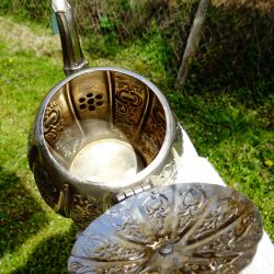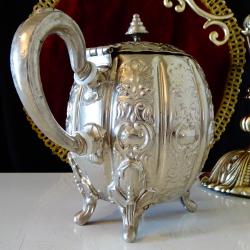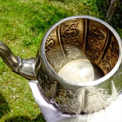 Посребрен меден чайник, кана, ковани орнаменти Шефилд, печат.