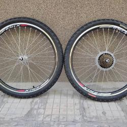 Комплект НОВИ капли и гуми W-FENIX 24 цола, предна и задна нови алуминиеви двойностенни усилени капли 24 цола с 36 никилирани спици, алуминиеви главини с фабрични капсуловани лагери, гуми със спортен грайфер VIPER 24 х 1,95, с монтиран венец SHIMANO MF-TZ500, каплите са с много голяма инерция. Повече инфо на WWW. VELOSIPEDITE. EU